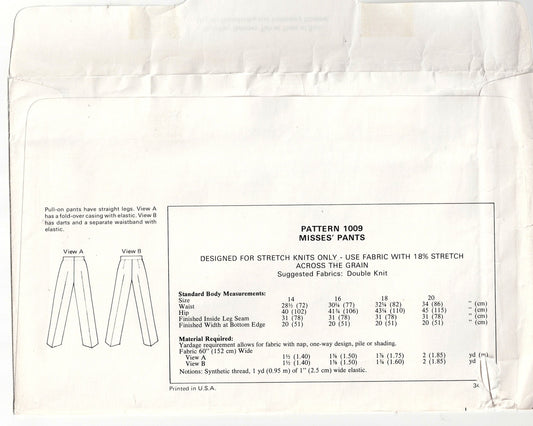 Kwik Sew 1009 Womens Stretch Knit Straight Leg Pants 1970s Vintage Sewing Pattern Waist 28 - 34 Inches UNCUT Factory Folded