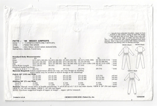 Kwik Sew 2588 Womens Stretch Knit Winter Jumpsuits 1990s Vintage Sewing Pattern Size XS - XL UNCUT Factory Folded