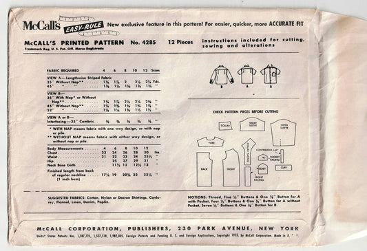 McCall's 4285 Boys Classic Button Front Shirt 1950s Vintage Sewing Pattern Size 10 UNCUT Factory Folded
