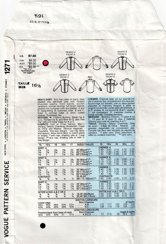 Patrón de costura Vogue Basic Design 1271 para camisas clásicas de negocios o casuales para hombres, años 80, vintage, pecho de 40 pulgadas