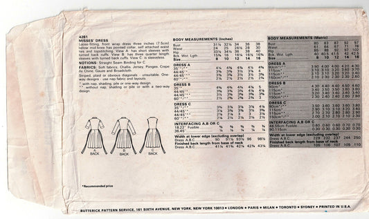 Butterick 4261 Womens Wrap Dress with Sleeve Options 1980s Vintage Sewing Pattern Size 14 Bust 36 Inches UNCUT Factory Folded