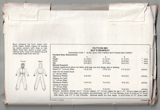Kwik Sew 863 Boys Quilted Retro Snowsuit with Fur Trim 1970s Vintage Sewing Pattern Size 4 - 8 UNCUT Factory Folded