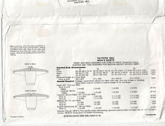 McCall's 8977 Mens Casual Pullover Tops 1990s Vintage Sewing Pattern 42 - 44 inches UNCUT Factory Folded