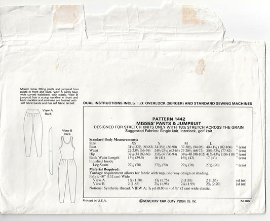 Kwik Sew 1442 Womens Stretch Knit Tapered Pants & Jumpsuit 1980s Vintage Sewing Pattern Size XS - XL UNCUT Factory Folded