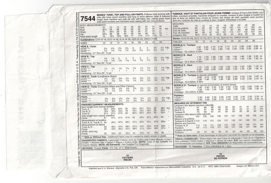 McCall's 7544 EASY Womens Casual Tops Tunics & Pants 1990s Vintage Sewing Pattern Size 10 - 14 UNCUT Factory Folded