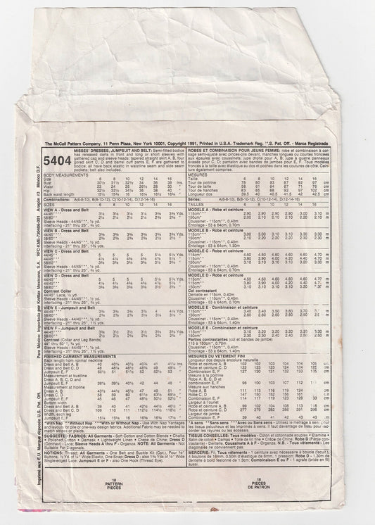 McCall's 5404 Womens Dress Jumpsuit & Belt 1990s Vintage Sewing Pattern Size 12 - 16 UNCUT Factory Folded