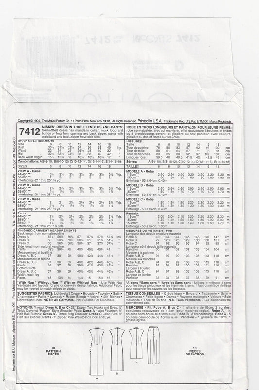 Patrón de costura vintage de los años 90 para vestido y pantalones cheongsam de mujer McCall's 7412, talla 12-16, sin cortar, doblado de fábrica