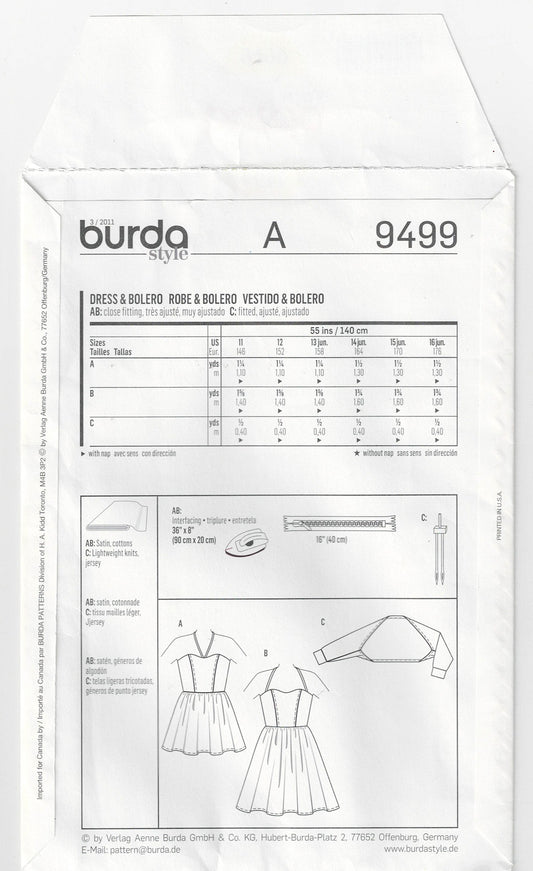 Burda 9499 Teen Girls Party Formal Dress & Knit Bolero Out Of Print Sewing Pattern Sizes 11 -16 UNCUT Factory Folded