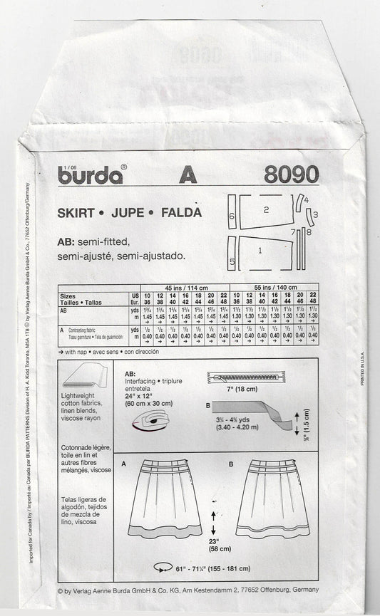 Burda 8090 Patrón de costura de faldas hipster para mujer agotadas, tallas 10 a 22, sin cortar, dobladas de fábrica