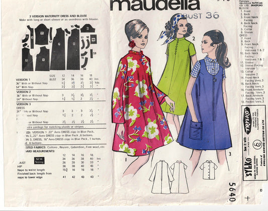 Patrón de costura vintage de los años 60 para vestido y blusa de maternidad Maudella 5640, busto de 36 pulgadas, doblado de fábrica, SIN USAR