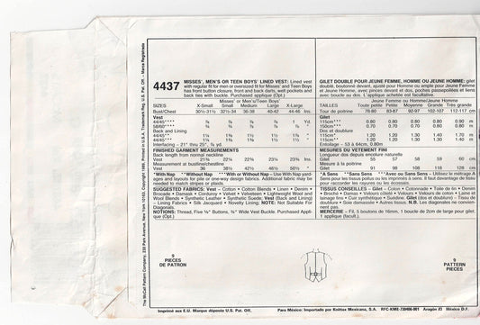 Patrón de costura de chalecos entallados y forrados unisex McCall's 4437 para hombres y mujeres, estilo vintage de los años 80, talla pequeña, sin cortar, doblado de fábrica