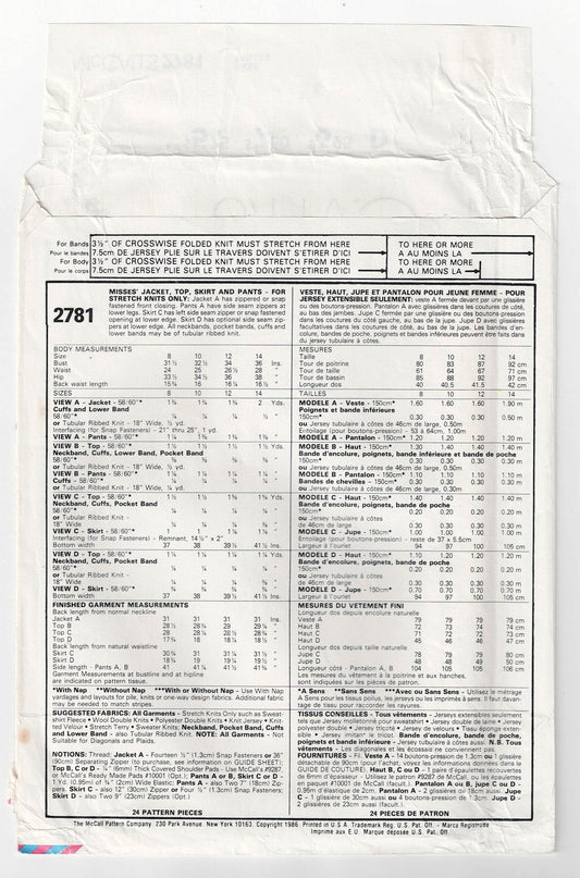 Patrón de costura vintage de los años 80 para chaqueta, top, falda y pantalones de punto elástico para mujer McCall's 2781, talla 14, busto de 36 pulgadas, sin cortar, doblado de fábrica