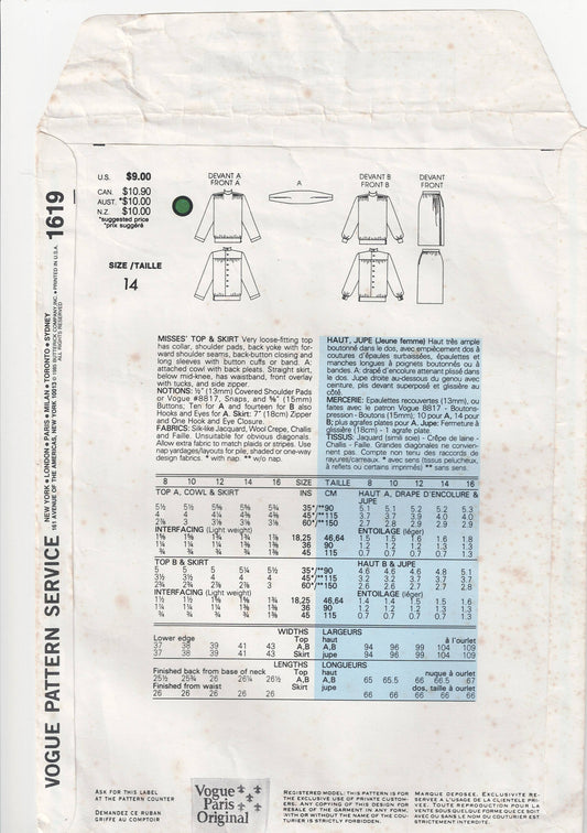 Patrón de costura original de Vogue Paris 1619 NINA RICCI para mujer, top con hombros plisados y falda cruzada simulada, años 80, talla 14, busto 36 pulgadas, SIN CORTAR, doblado de fábrica