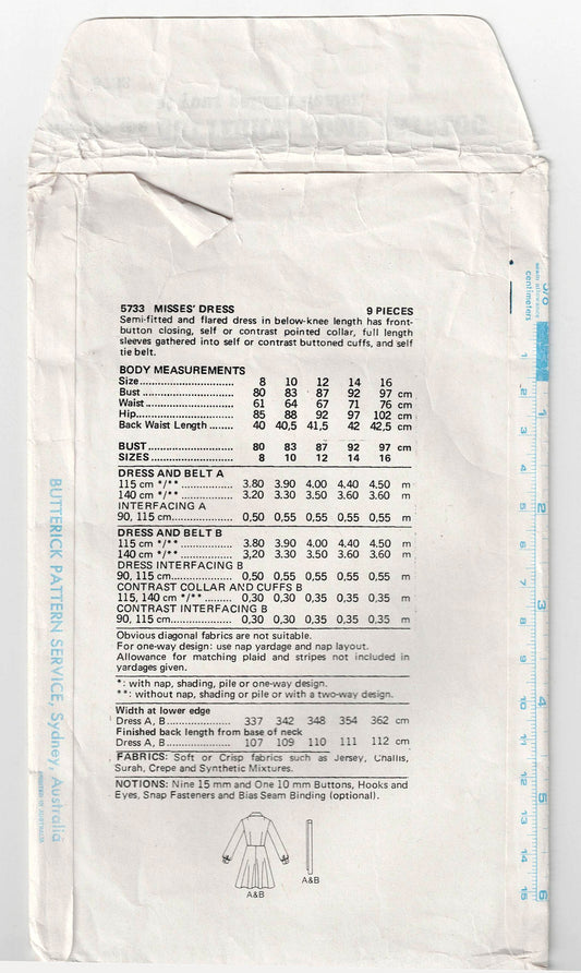 Patrón de costura vintage de los años 70 para vestido camisero ajustado y acampanado con cuello ancho Butterick 5733 para mujer, talla 14, busto 36 pulgadas