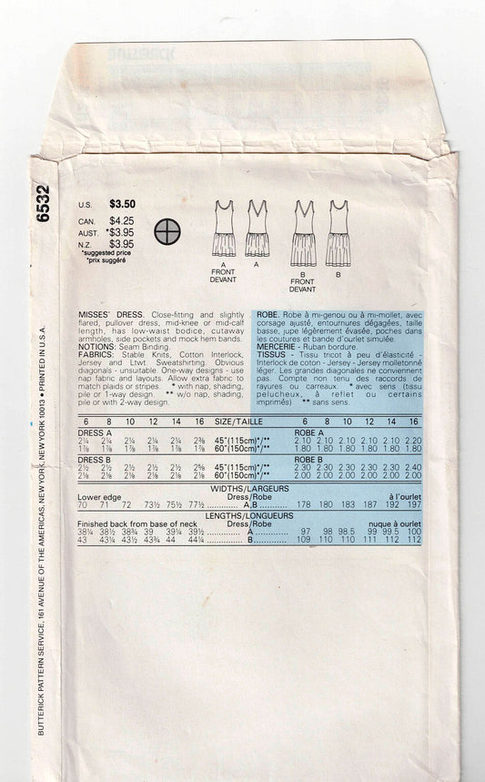 Patrón de costura Butterick 6532 para vestido veraniego con cintura caída para mujer, estilo vintage de los años 80, talla 12-16, sin cortar, doblado de fábrica