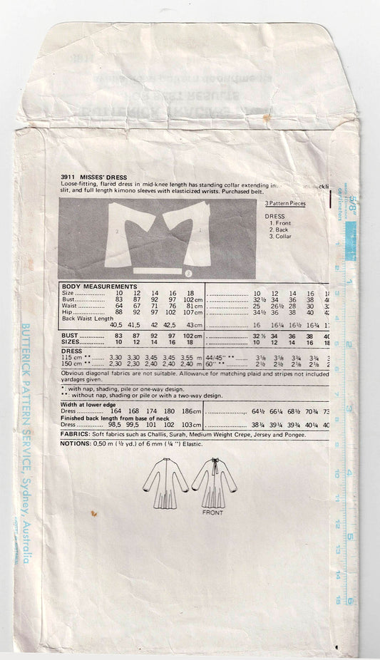 Patrón de costura vintage de los años 70 para vestido con mangas estilo kimono Butterick 3911 para mujer, talla 12, busto de 34 pulgadas