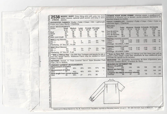 Patrón de costura vintage de los años 90 para camisas de 3 horas de McCall's 2538 PALMER PLETSCH de corte clásico para mujer, talla 16-18, sin cortar, doblado de fábrica
