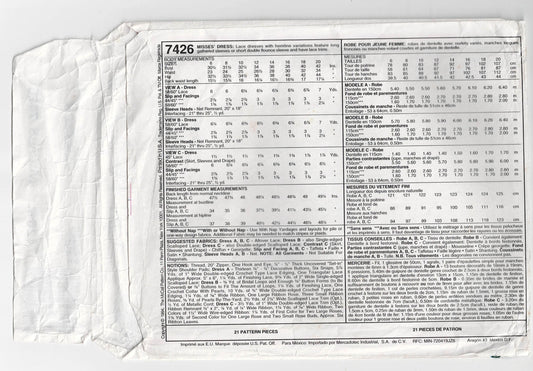 Patrón de costura agotado para vestido de novia de encaje con volantes para mujer ALICYN EXCLUSIVES de McCall's 7426, talla 8 o 14, sin cortar, doblado de fábrica