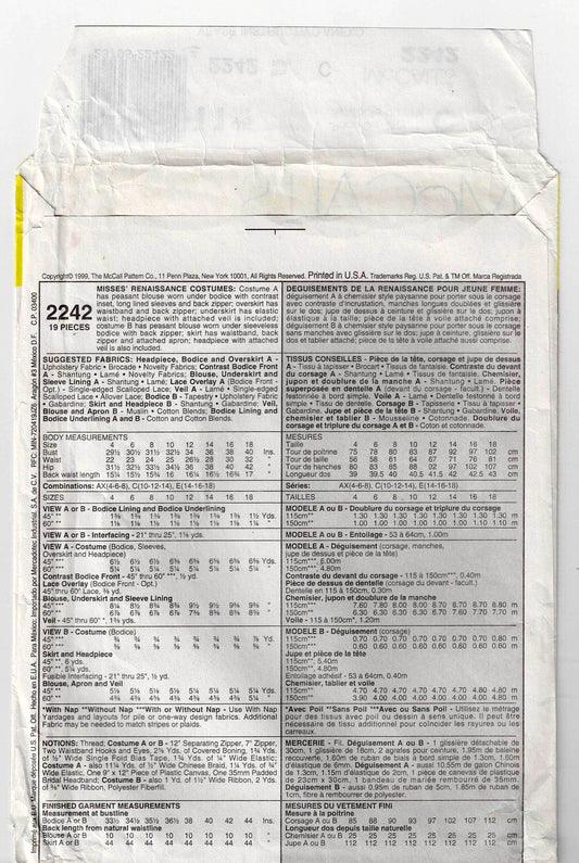 Patrón de costura McCall's 2242 para traje renacentista de mujer, años 1990, talla 10-14, sin cortar, doblado de fábrica