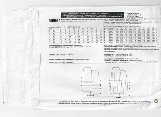 Patrón de costura de faldas de punto elástico para mujer McCall's 6654 EASY, agotado, talla 14-22, sin cortar, doblado de fábrica