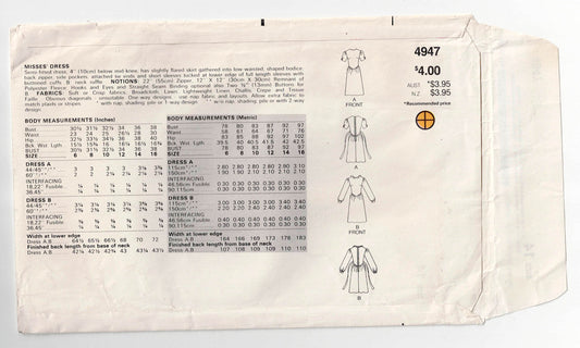 Patrón de costura vintage de los años 80 para vestido de mujer con mangas abullonadas y cintura caída BELLE FRANCE Butterick 4947, talla 14, busto 36 pulgadas, sin cortar, doblado de fábrica