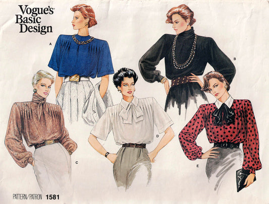 Patrón de costura vintage de los años 80 para blusas de cuello alto con frunces en el frente para mujer Vogue Basic Design 1581, talla 12, busto de 34 pulgadas, sin cortar, doblado de fábrica