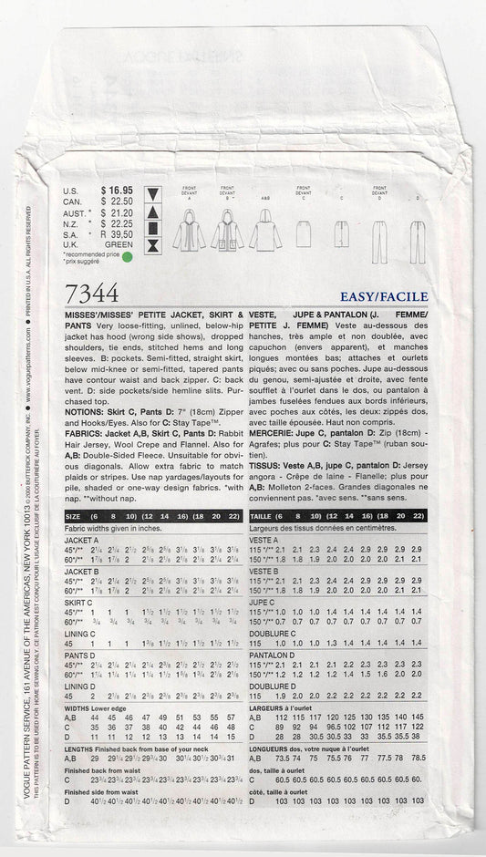 Patrón de costura de chaqueta, pantalón y falda con capucha para mujer Vogue Woman 7344, agotado, talla 12-16, sin cortar, doblado de fábrica