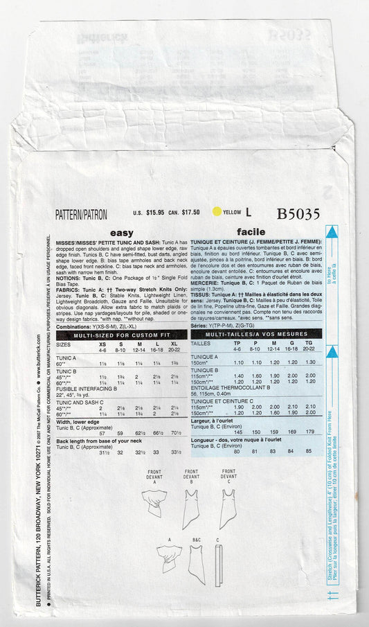 Patrón de costura Butterick 5035 para túnicas y fajas asimétricas de punto elástico para mujer, fácil de usar, en 1 hora, agotado, tallas XS-M o L-XL, sin cortar, doblado de fábrica