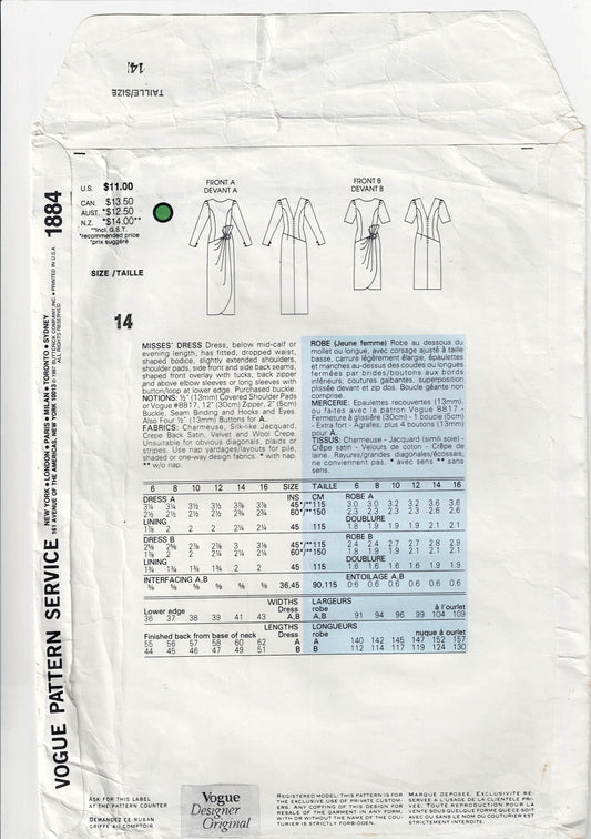 Patrón de costura original de la década de 1980 para vestido de noche, cóctel, fiesta, formal, asimétrico, drapeado, de Bellville Sassoon, diseñador de Vogue, original, 1884, talla 14, sin cortar, doblado de fábrica
