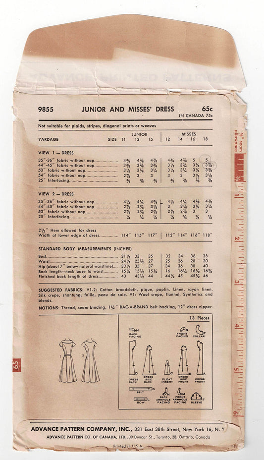 Patrón de costura vintage de los años 60 Advance 9855 para vestido de princesa con cuello enrollado al bies y falda plisada, talla 18, busto de 38 pulgadas, sin cortar, doblado de fábrica