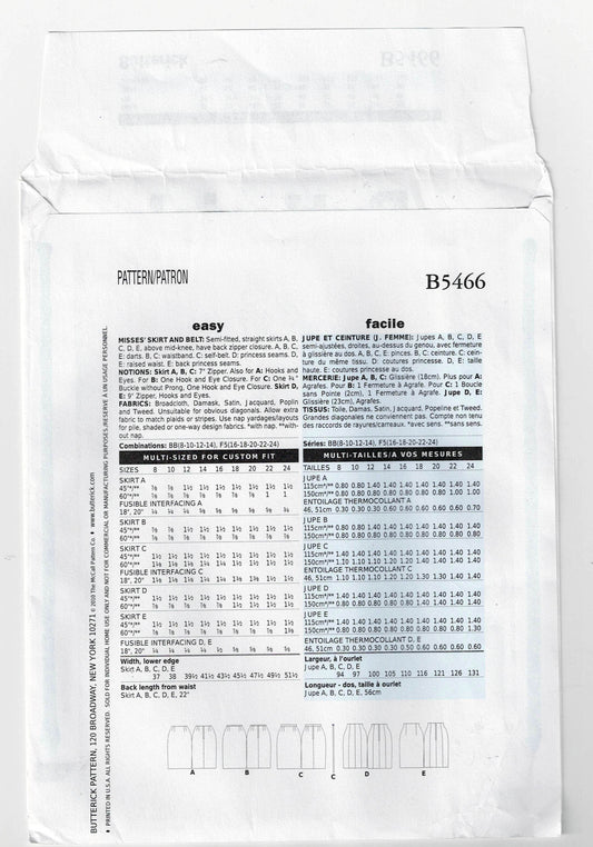 Patrón de costura de faldas de cintura alta y ajustadas fáciles de usar Butterick 5466 para mujer, sin cortar, dobladas de fábrica, talla 8-24