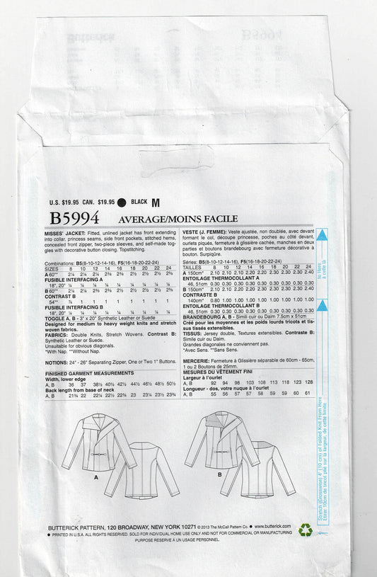 Patrón de costura agotado para chaquetas asimétricas de cuello ancho con bolsillos Butterick 5994 KATHERINE TILTON para mujer, tallas 16 a 24, sin cortar, doblado de fábrica