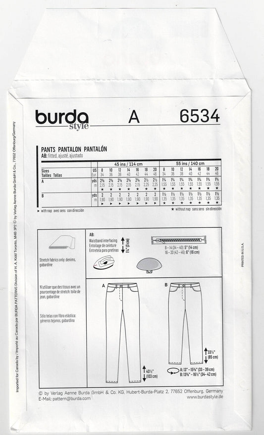 Patrón de costura Burda Style 6534 para jeans ajustados de tiro bajo para mujer, agotado, tallas 8 a 20, sin cortar, doblado de fábrica