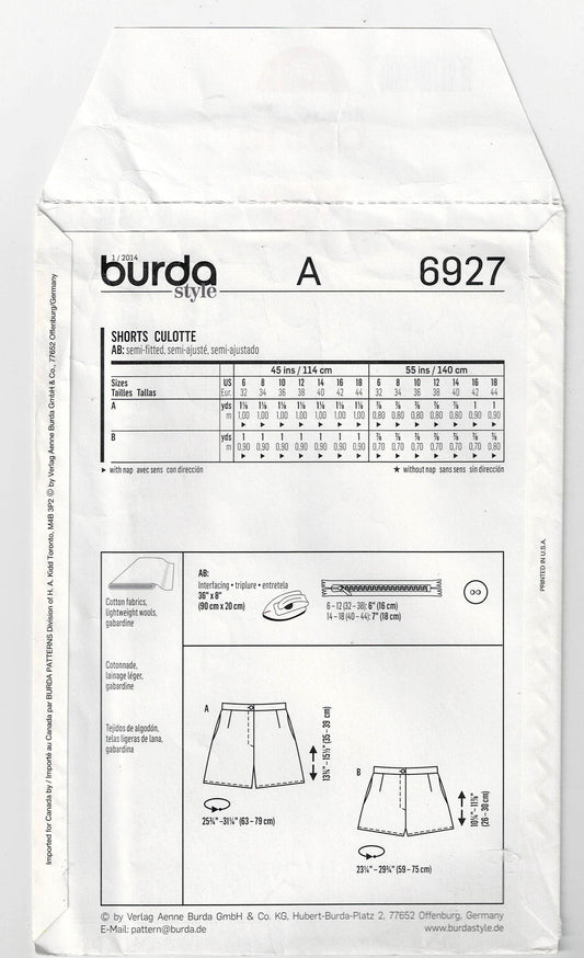 Patrón de costura Burda Young 6927 para pantalones cortos de cintura alta o regular para mujer, agotado, tallas 6 a 18, sin cortar, doblado de fábrica