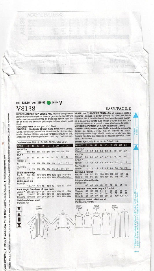 Patrón de costura de vestido y prendas separadas de punto elástico para mujer Vogue Easy Options 8138, agotado, talla 8-12, sin cortar, doblado de fábricaPrecio habitual $12.00 AUDPrecio habitualPrecio unitario / por$12.00 AUDPrecio de oferta $12.00 AUD