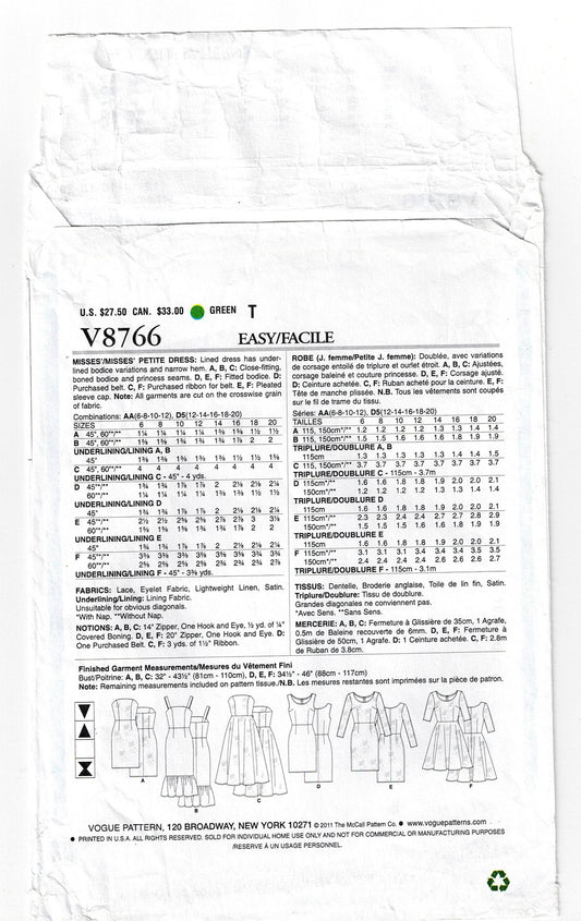 Patrón de costura de vestido ajustado para mujer Vogue Easy Options 8766 con variaciones de falda y mangas, agotado, talla 12-20, sin cortar, doblado de fábricaPrecio habitual $12.00 AUDPrecio habitualPrecio unitario / por$12.00 AUDPrecio de oferta $12.00 AUD
