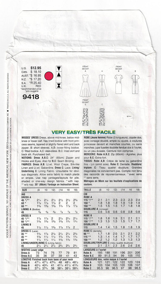 Patrón de costura vintage de los años 90 para vestido de mujer con corpiño princesa y falda ajustada o acampanada Vogue Easy Options 9418, talla 14-18, doblado de fábrica y sin cortarPrecio habitual $12.00 AUDPrecio habitualPrecio unitario / por$12.00 AUDPrecio de oferta $12.00 AUD