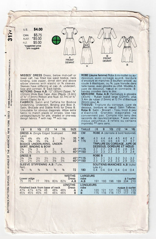 Butterick 3174 Vestido de fiesta de noche con escote en V y cintura baja para dama de honor, mangas abullonadas o largas, patrón de costura vintage de los años 80, talla 6 a 10Precio habitual $8.00 AUDPrecio habitualPrecio unitario / por$8.00 AUDPrecio de oferta $8.00 AUD