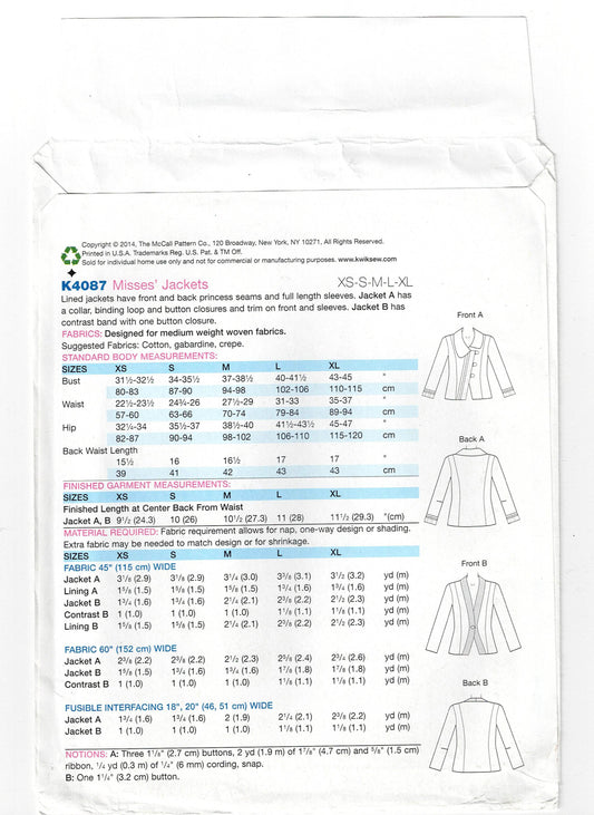 Patrón de costura agotado para chaquetas con forro y costura princesa para mujer Kwik Sew 4087, talla XS a XL, sin cortar, doblado de fábricaPrecio habitual $10.00 AUDPrecio habitualPrecio unitario / por$10.00 AUDPrecio de oferta $10.00 AUD