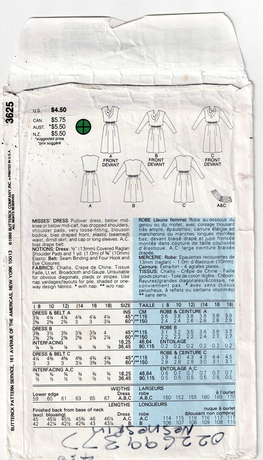 Patrón de costura vintage de los años 80 Butterick 3625 para vestido tipo blusón con escote drapeado y cintura fruncida, talla 14-18, doblado de fábrica y sin cortarPrecio habitual $9.00 AUDPrecio habitualPrecio unitario / por$9.00 AUDPrecio de oferta $9.00 AUD