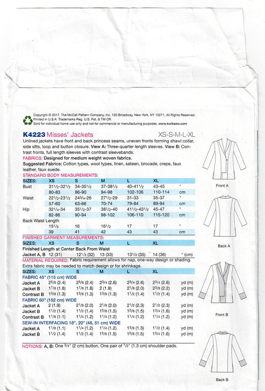 Patrón de costura agotado para chaquetas asimétricas con ribetes para mujer Kwik Sew 4223, talla XS a XL, sin cortar, doblado de fábricaPrecio habitual $10.00 AUDPrecio habitualPrecio unitario / por$10.00 AUDPrecio de oferta $10.00 AUD