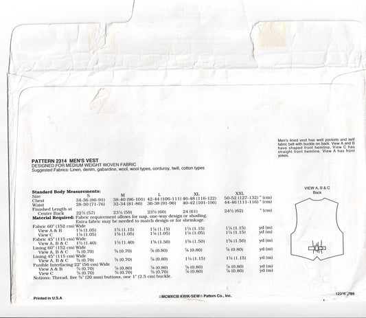 Patrón de costura vintage de los años 90 Kwik Sew 2314 para chalecos de hombre en 3 estilos, tallas S a XXL, sin cortar, doblado de fábricaPrecio habitual $10.00 AUDPrecio habitualPrecio unitario / por$10.00 AUDPrecio de oferta $10.00 AUD