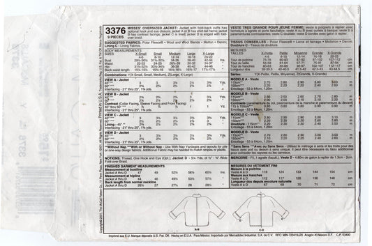 Patrón de costura agotado para chaqueta extragrande McCall's 3376 PALMER/PLETSCH de 2 horas para mujer, talla XS-MED o L-XL, sin cortar, doblado de fábrica