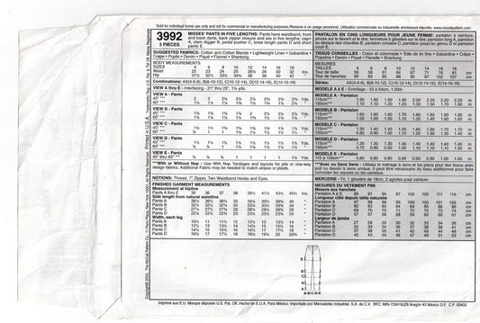 Patrón de costura agotado para pantalones ajustados fáciles de McCall 3992 para mujer, en 5 largos, tallas 14 a 18, sin cortar, doblado de fábrica