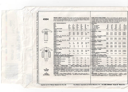 Patrón de costura vintage de los años 80 para vestido recto con cinturón adjunto para mujer de la colección NY 4504 de McCall, talla 12, sin cortar, doblado de fábrica