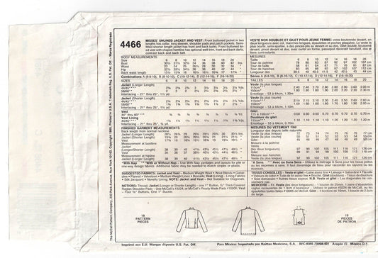 Patrón de costura vintage de los años 80 para chaquetas y chalecos sin forro de la colección Woman's Day 4466 de McCall, tallas 10 a 14, sin cortar y doblado de fábrica