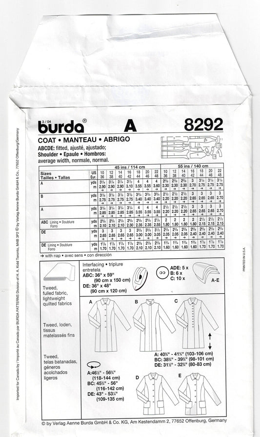 Patrón de costura Burda 8292 para abrigos y chaquetas de mujer, agotado, tallas 10 a 22, sin cortar, doblado de fábrica