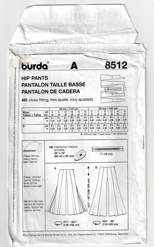 Patrón de costura Burda 8512 de pantalón palazzo acampanado de pierna ancha para mujer, agotado, tallas 6 a 16, sin cortar, doblado de fábrica