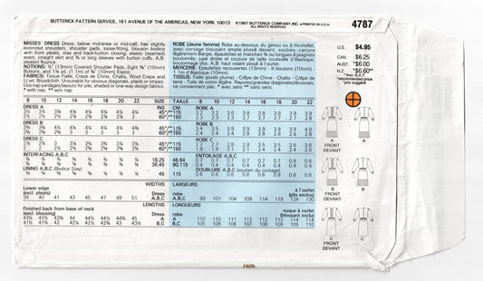 Patrón de costura vintage de los años 80 para vestido tipo blusón plisado de mujer Butterick 4787 JEAN NIDETCH, talla 18, busto de 40 pulgadas, sin cortar, doblado de fábrica