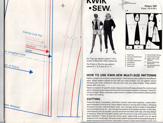 Patrón de costura vintage de los años 80 para pantalones cortos y blusas con bloques de color elásticos Kwik Sew 1387 para mujer, talla XS a L, doblado de fábrica sin cortar